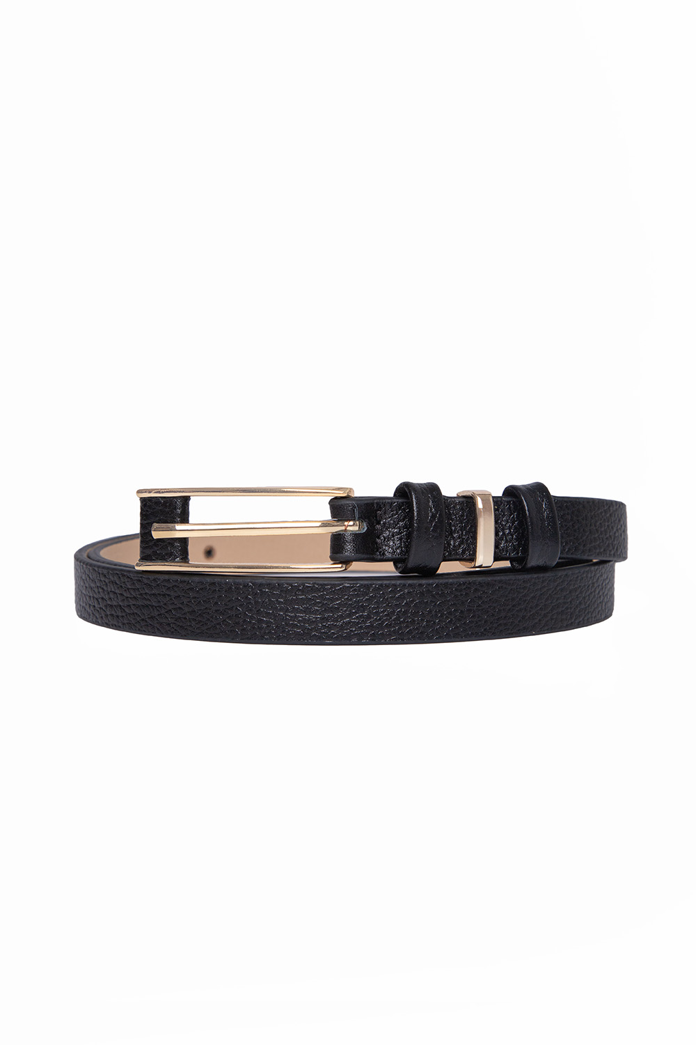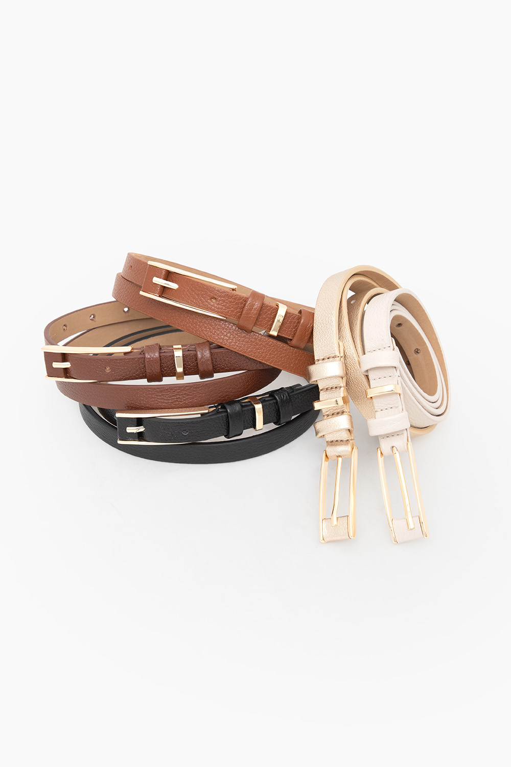 Cinto de couro fino com fivela dourada encapada e três passantes em cores clássicas. Elegante e versátil, perfeito para qualquer ocasião!