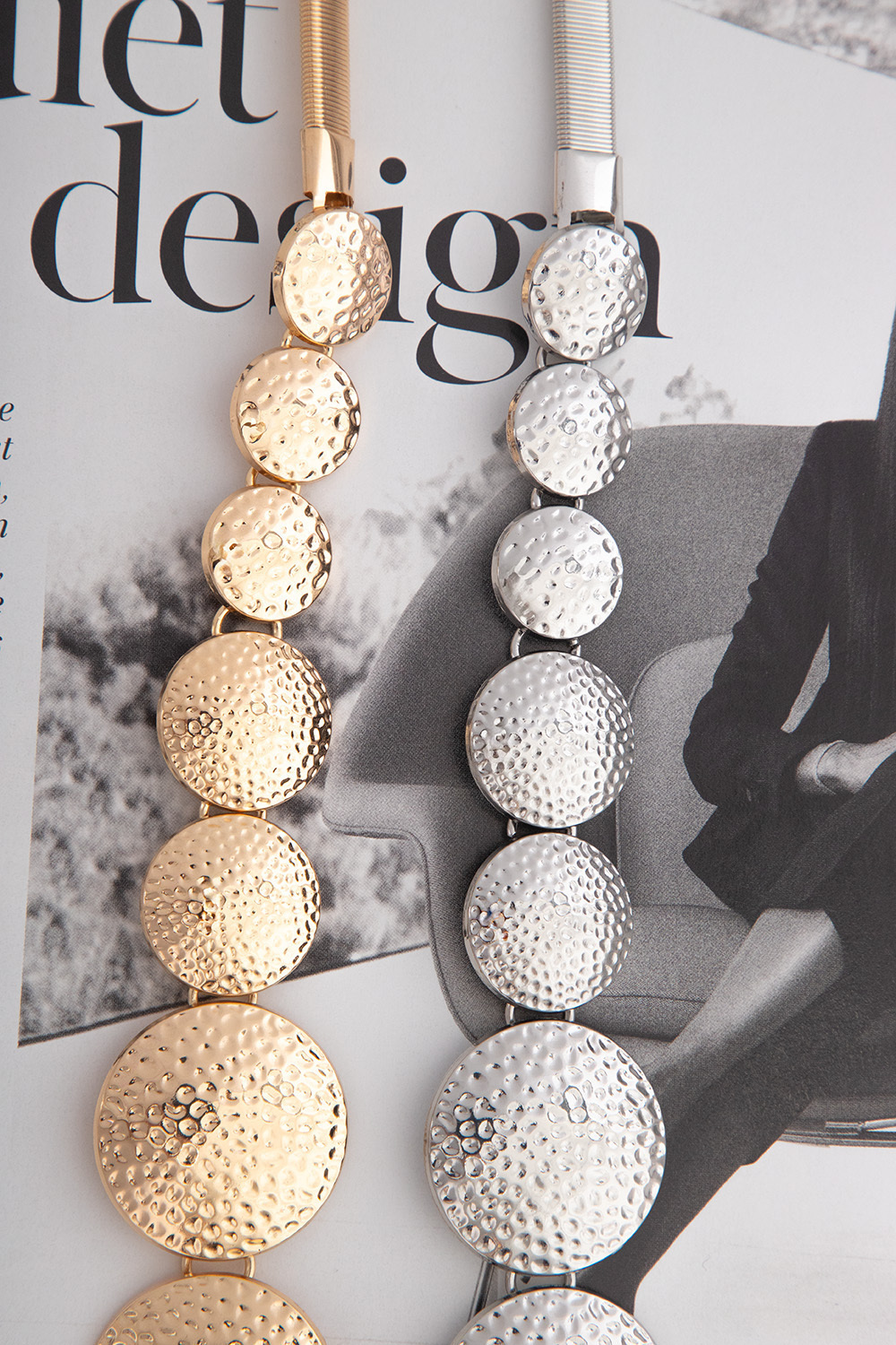 Cinto confeccionado em metal dourado com acabamento polido, brilhante e resistente. Composto por uma fileira de discos metálicos em tamanho gradativo, todos com textura martelada. Fechamento fronta com mola metálica flexível, que proporciona ajuste confortável ao corpo.