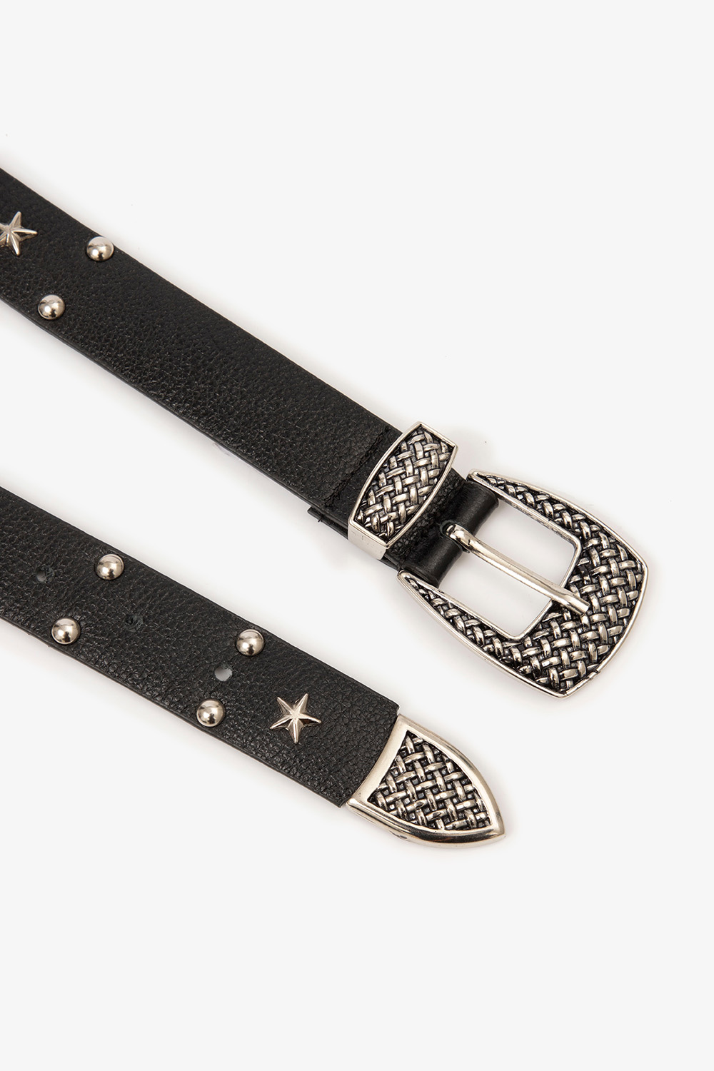 Escolha ideal para quem busca um acessório com personalidade e estilo marcante. Confeccionado em couro preto de alta qualidade, ele se destaca pelos detalhes em metal prateado: aplicações de estrelas e tachas arredondadas ao longo do cinto, além de uma fivela elaborada com textura trançada, passador e ponteira combinando. O design western contemporâneo torna este cinto perfeito para elevar produções básicas ou complementar looks ousados com atitude. Use com jeans, vestidos ou até sobre blazers para um toque de originalidade.