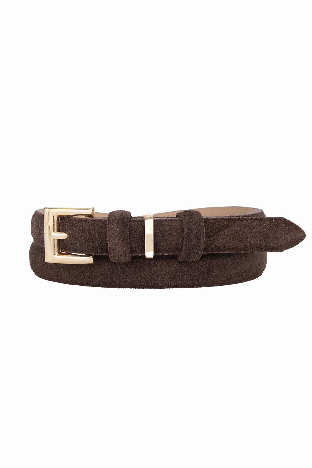 Cinto em couro camurça com fivela quadrada dourada e três passantes.