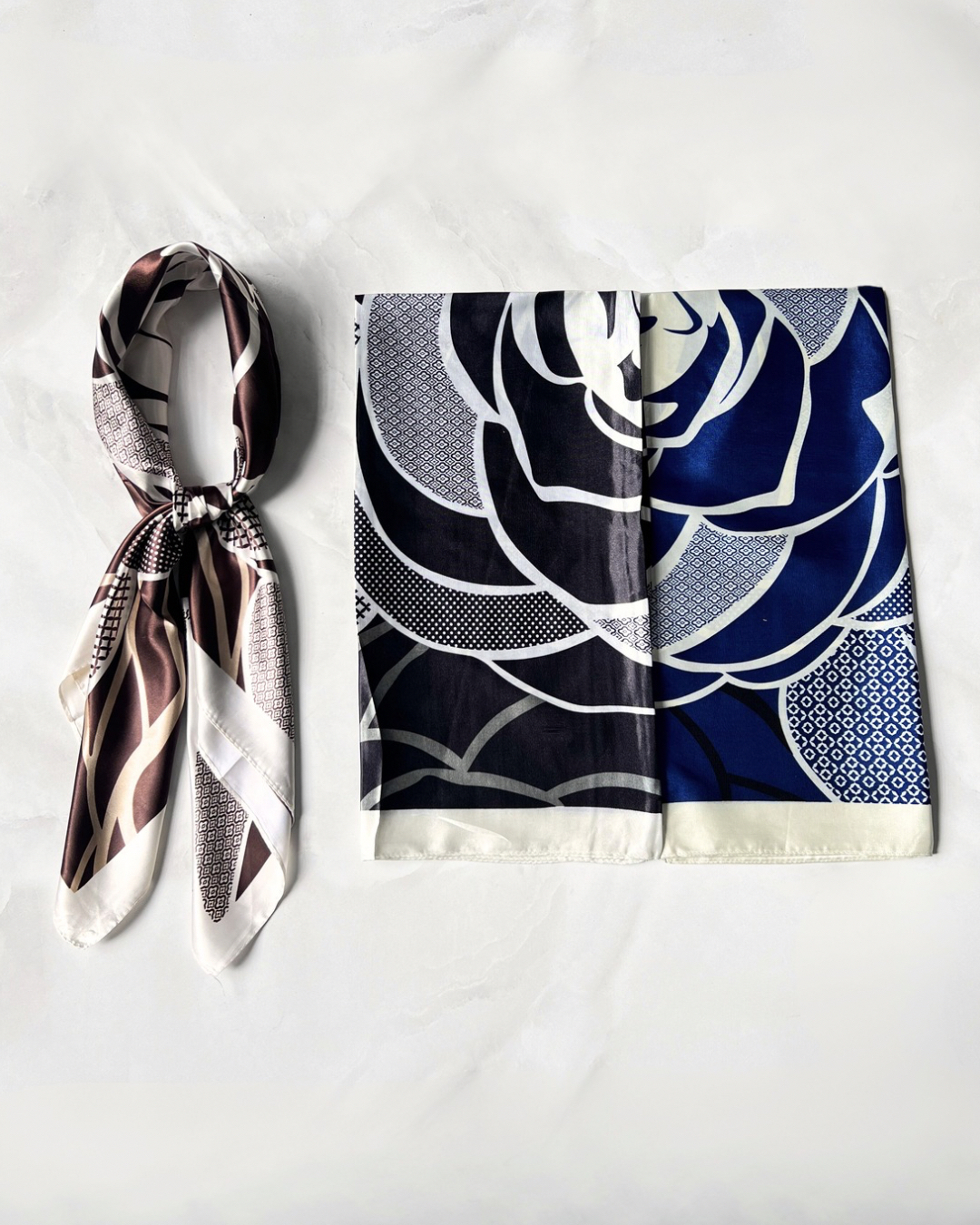 Lenço de cetim 90x90 com estampa de formas geométricas abstratas que se unem formando uma flor. Uma peça elegante e contemporânea, perfeita para trazer personalidade ao look — use no pescoço, no cabelo, na bolsa ou como top.