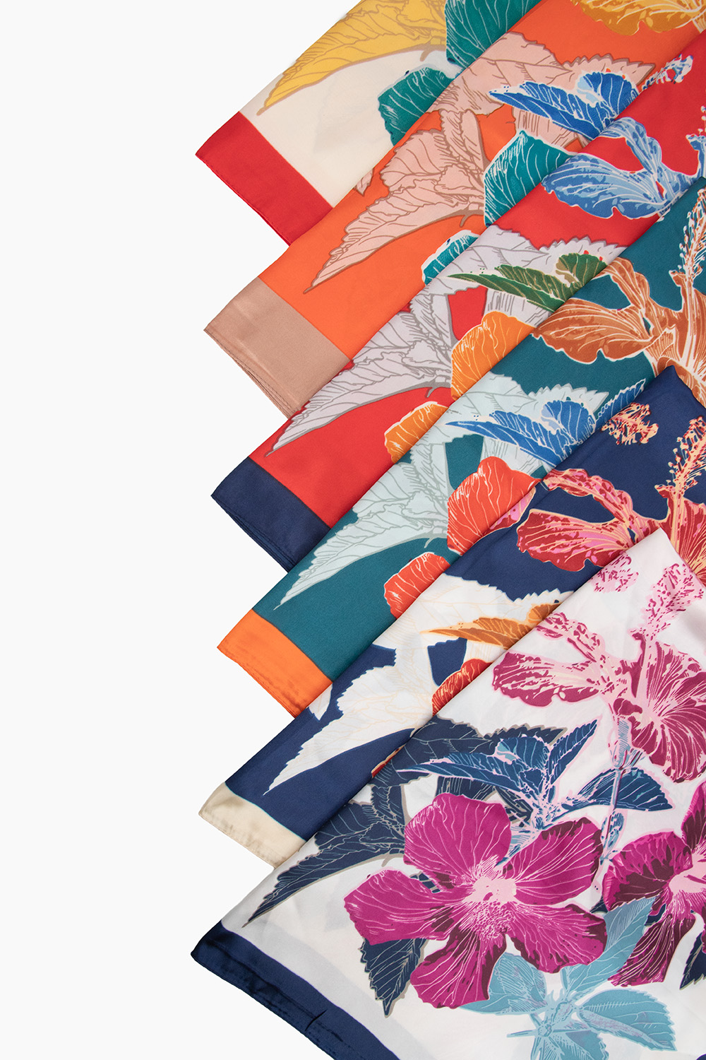 Lenço em cetim com estampa exclusiva inspirada no hibisco. Medidas 90x90 cm, acabamento acetinado e toque suave. Versátil para diferentes formas de uso: pescoço, cabelo, alça de bolsa e cintura. Ideal para compor looks casuais e elegantes com praticidade.